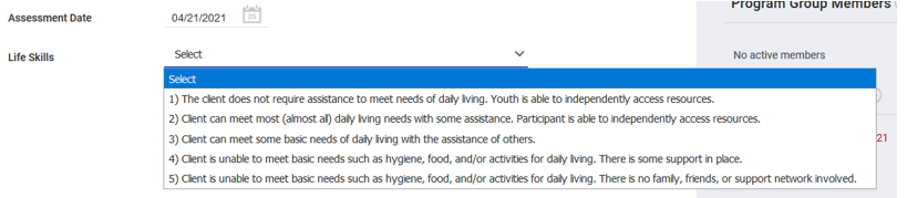 For each area of functioning, case managers should choose from the 5 descriptions that best describe the participant's current situation. The first option will reflect the lowest level of reliance on assistance for that area. The fifth option will reflect the highest reliance on assistance. If a participant's situation falls in between two categories, choose the more acute/reliant option. If a question does not apply, answer with the lowest scored or least reliant option. Every question must be answered.