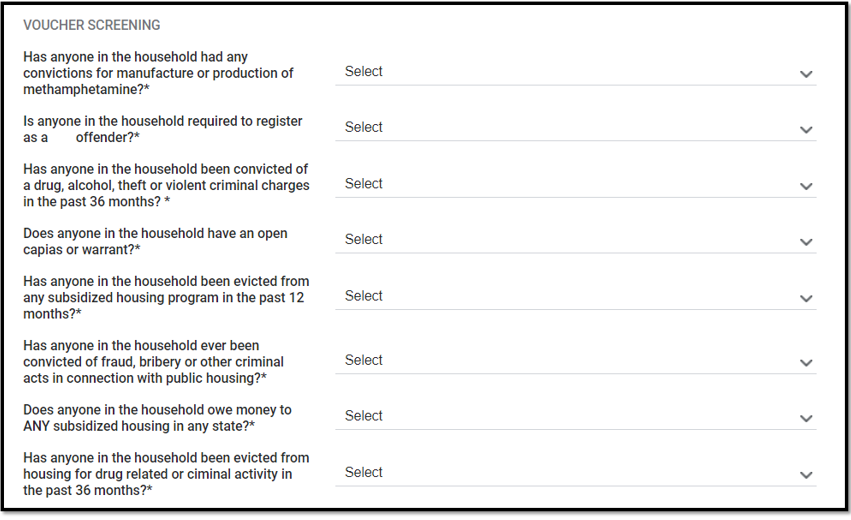 All drop down options are Yes/No. If "yes" is answered for "Does anyone in the household owe money to ANY subsidized housing in any state," also answer the dependent fields ("Is the debt older than 8 years?" and "Amount of debt owed").