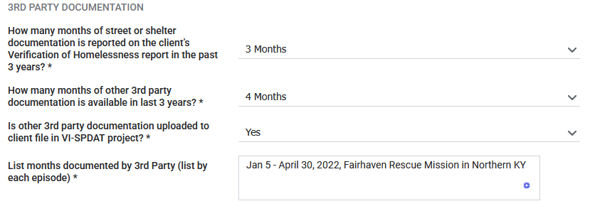 List months documented by 3rd party (list each episode): Provide details about each episode of homelessness documented by the 3rd party.
