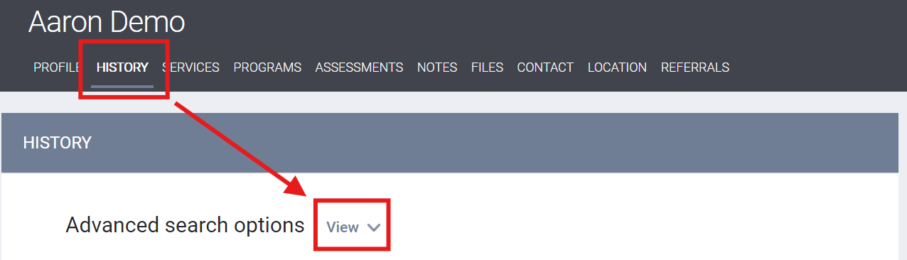 The client-level HISTORY tab provides information on a client's service items, program enrollments, referrals, reservations, assessments, and CE events recorded in Clarity from any agency the client has documented activity with.