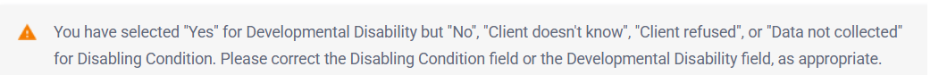 Solution: Switch “Disabling Condition” answer to Yes since Developmental Disability was marked as yes and that is automatically considered a Disabling Condition, as seen in the error message at the bottom.