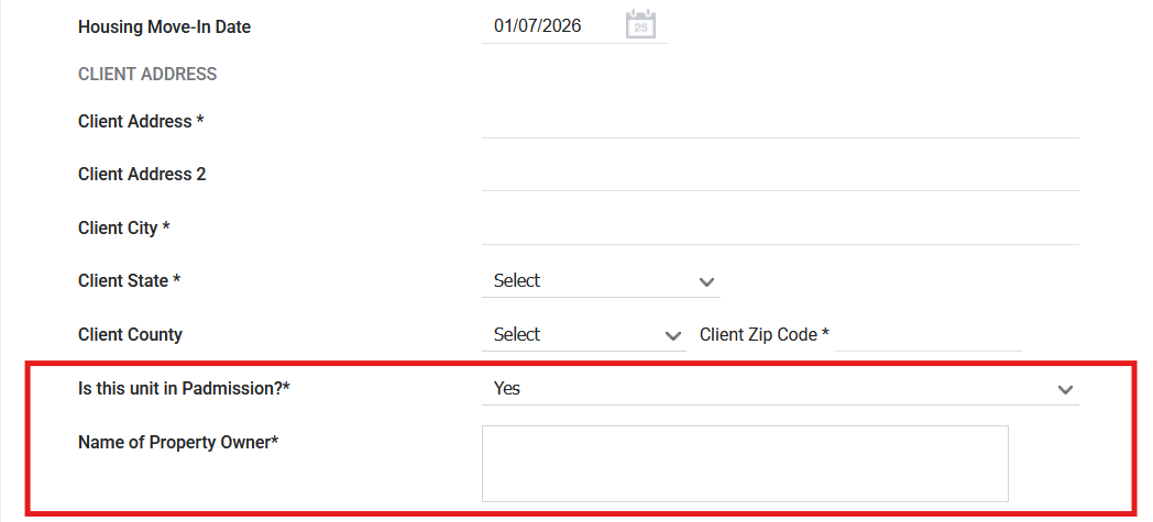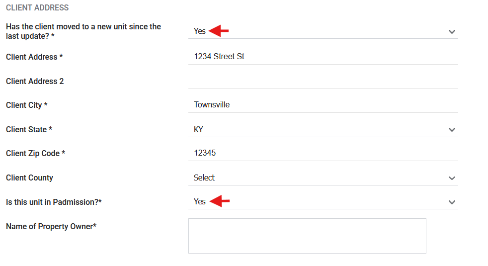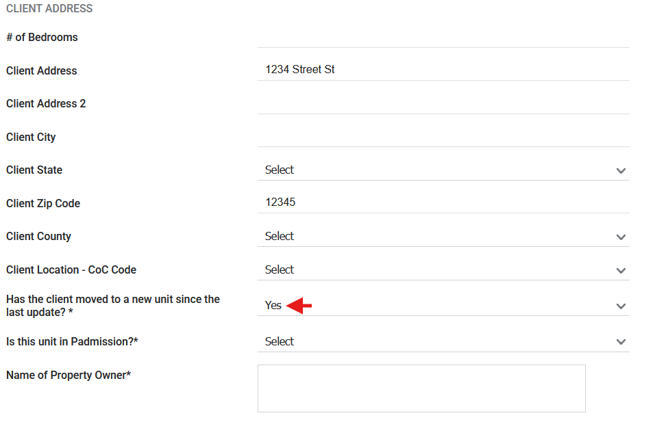 In a Status Update Assessment, the first data field in the Client Address section asks: "Has the client moved to a new unit since the last update?" After selecting yes in that field, the question "Is this unit in Padmission" will appear at the bottom of the Client Address section. Answering yes will make the "Name of Property Owner" data field visible.