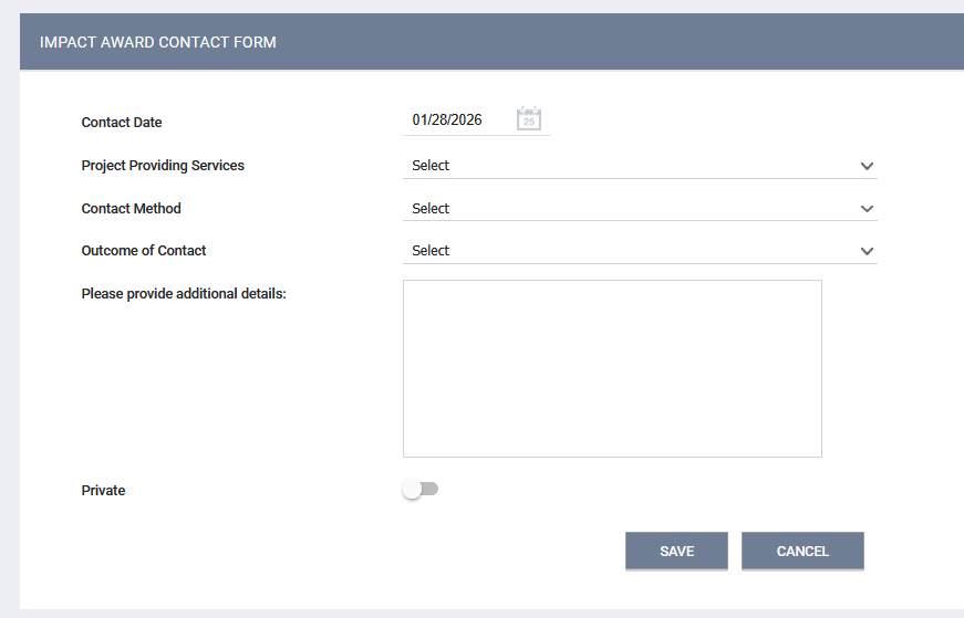 The Contact Form is a client-level navigation tab assessment. It is used to document each contact with a client and the outcome of that contact.