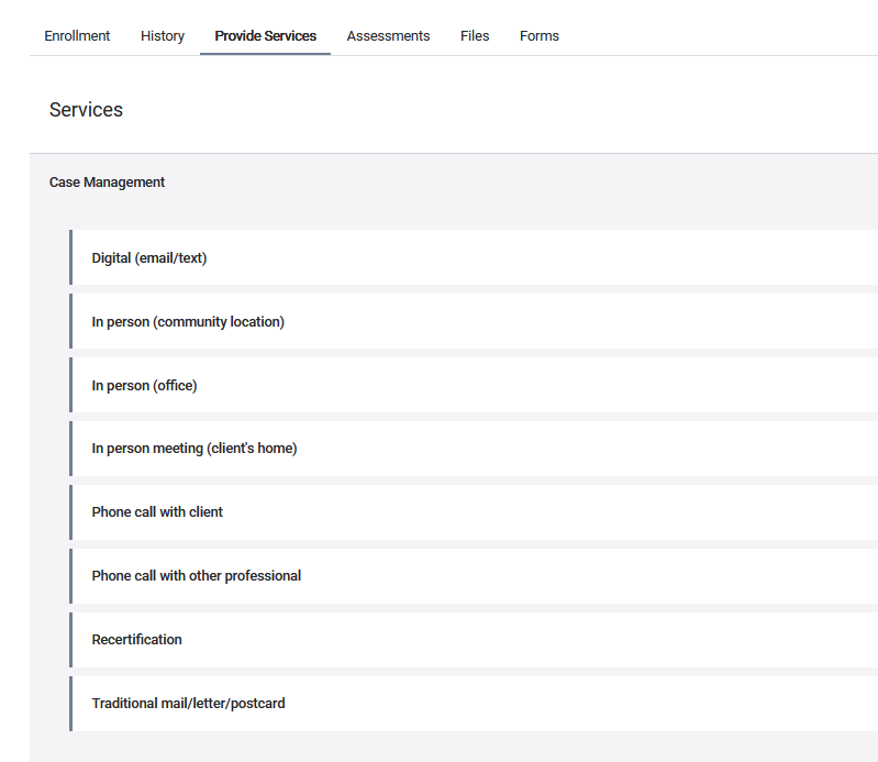 Go to the program-level Provide Services tab and click on the "Case Management" option to expand it. Choose the sub-type that best describes the type of interaction that took place. Digital or in-person? If in-person, where?