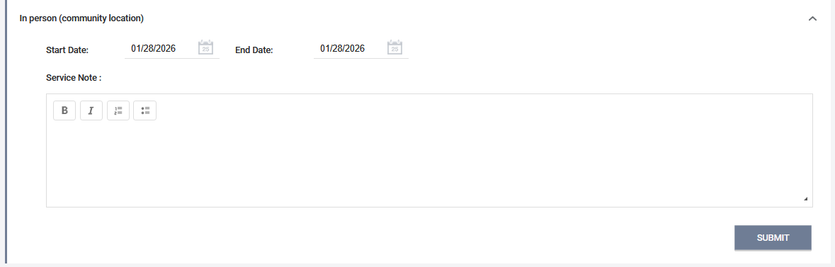 From there, fill in the date the service was provided (the start and end dates should be the same), enter any relevant information in the notes field, and click SUBMIT. The services can be viewed from both the program and client-level History tabs.
